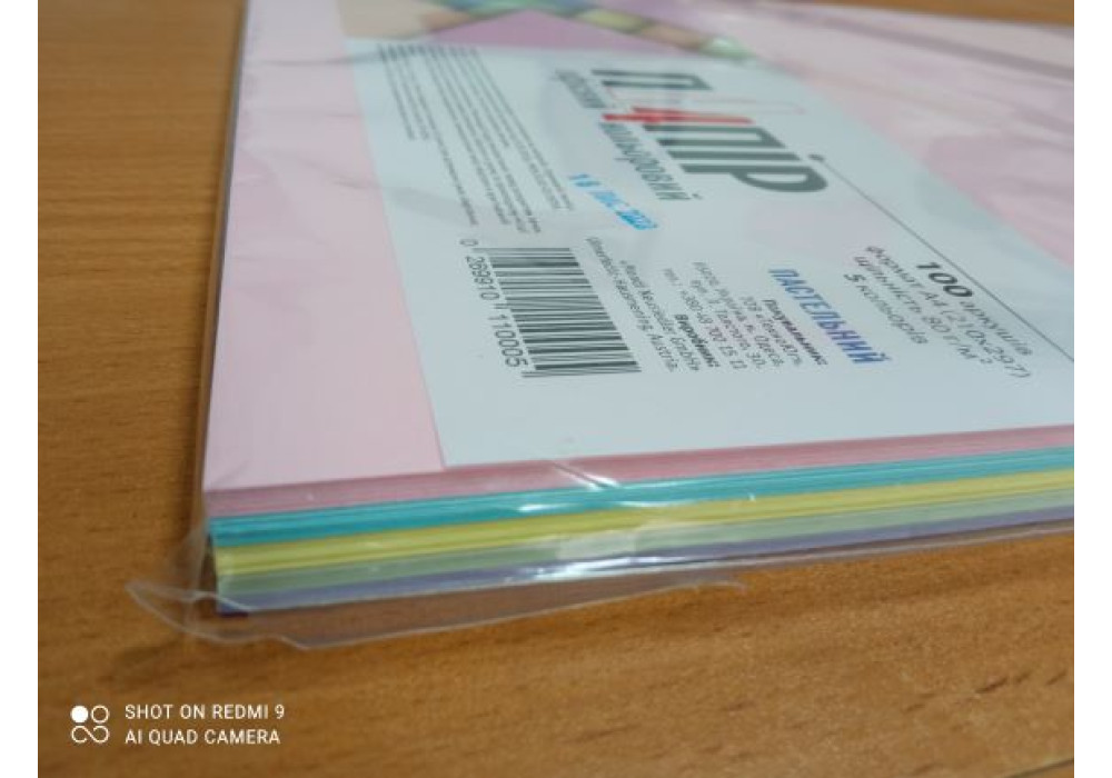 Набір кольорового паперу формату А4 щільністю 80г/м2, в упаковці 100 аркушів, 5 пастельних кольорів по 20 аркушів.