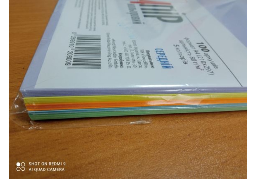 Набір кольорового паперу формату А4 щільністю 80г/м2, в упаковці 100 аркушів, 5 кольорів по 20 аркушів.